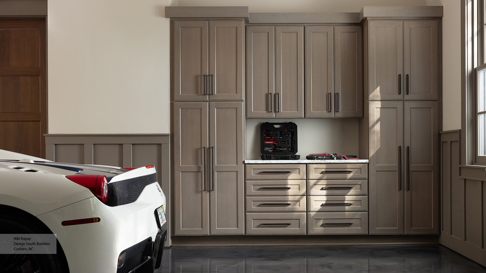 This comprehensive setup provides an abundance of versatile storage, from tall utility cabinets perfect for larger items, to overhead wall units and numerous deep drawers designed to neatly house tools, equipment, and seasonal gear. Centered within this intelligent arrangement, a robust countertop creates an ideal workspace, allowing us to conquer projects with ease and maintain a clutter-free environment.